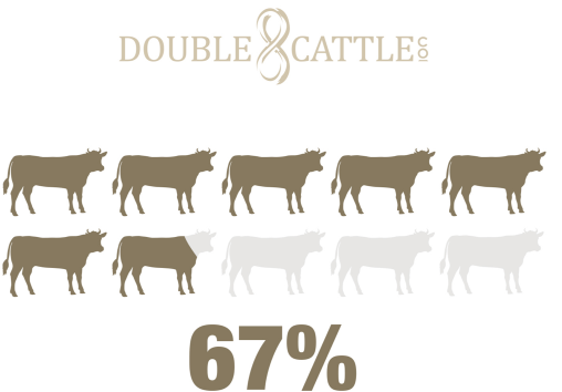 67% of Double 8 Cattle Co. Wagyu bred for premium beef products have tenderness scores between 6 and 10. In addition, 33% have tenderness scores between 9 and 10.